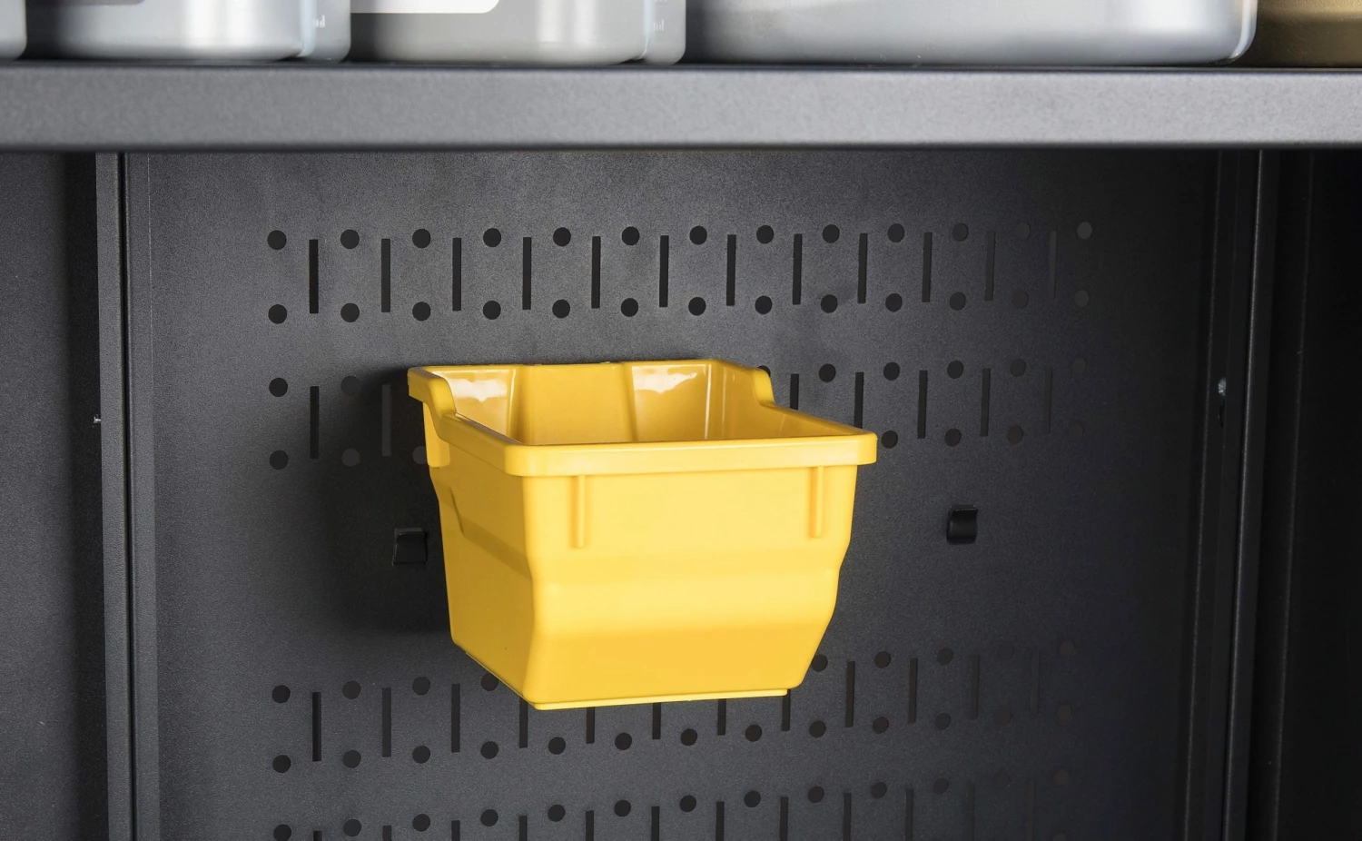 With heavy-duty construction and a powder-coated finish, this cabinet offers a durable storage solution for your garage. The 2-door, 36in tall cabinet is engineered for quick assembly and includes 4 shelves; 3 of these are adjustable. Each shelf has a weight capacity of 150lbs. pegboard on the back wall and the both doors give you unbeatable storage space for pegs and bins. The doors are lockable for peace-of-mind security. The back panel features 2 grommets for cord accessibility. Uneven floor? No problem…the adjustable feet can compensate. Complete your garage suite with other pieces like the work table, small base cabinet, or a wall cabinet (each sold separately). Dimensions are 72-inches H, 36-inches W, and 18.5-inches D.