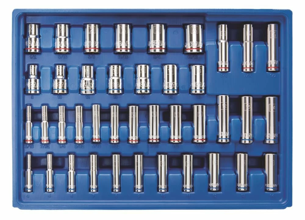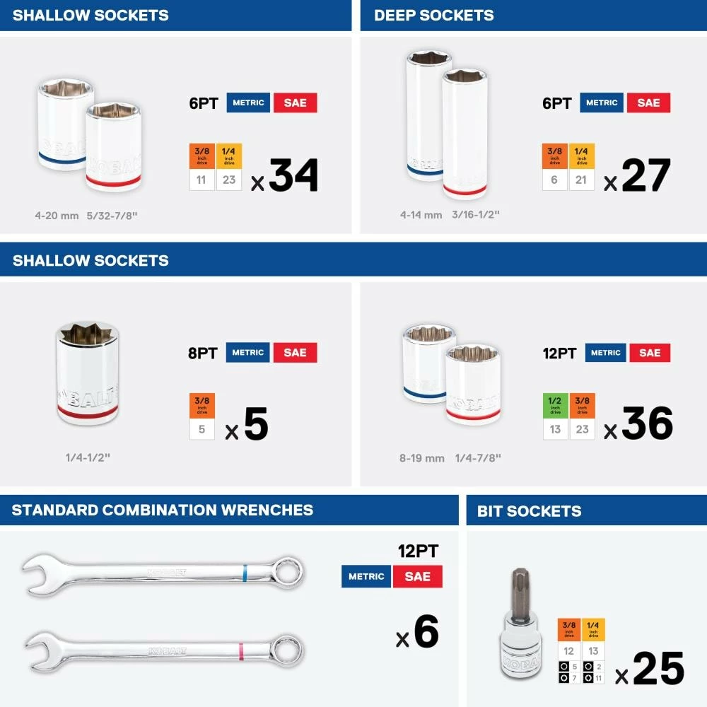 - Metric and SAE socket sizes are easy to identify with laser etched size call-outs and color-coded stripes to identify metric (blue) and SAE (red) measurements