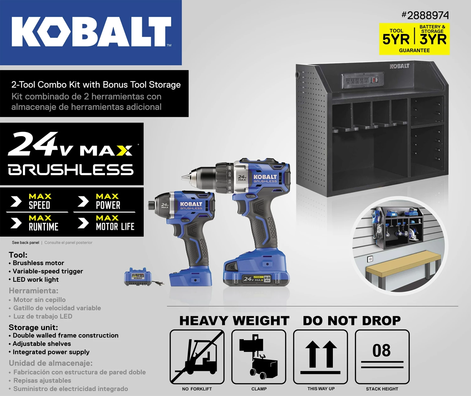 Kobalt’s 2 piece combo kit with bonus storage lets you charge and store all your 24V Max Power tools in one convenient location. Undertake a variety of heavy-duty jobs with this Kobalt 24V Max brushless motor power tool combo kit. Including a 1/2-in drill/driver and a 1/4-in impact driver, you can tackle tasks like high-speed drilling and installing subfloor with ease. The 24-volt max Li-ion battery powers these tools, providing extended runtime and more muscle, and their highly-efficient brushless motors are built to last. No matter the job, both tools are equipped with LED lights, so you can see what you’re doing even in dimly lit areas and backed by a 5-year limited warranty on the tools and the 3-year limited warranty on the battery. Bonus Storage Cabinet has a top charging bay with built-in power strip, 4 tool docks that can hold drills, drivers, and more and a large storage compartment with 2 adjustable and removable shelves.