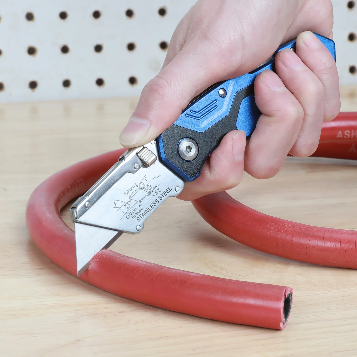 Durable construction, lightweight aluminum handle with comfortable grip. Lock back design safely locks the blade in place when in use. Compatible with most standard sized blades. Quick-change mechanism allows for easy blade replacement. Best for general purpose and precision cutting, such as cutting boxes, rope, carpet, plastic, leather, wallpaper, and more.